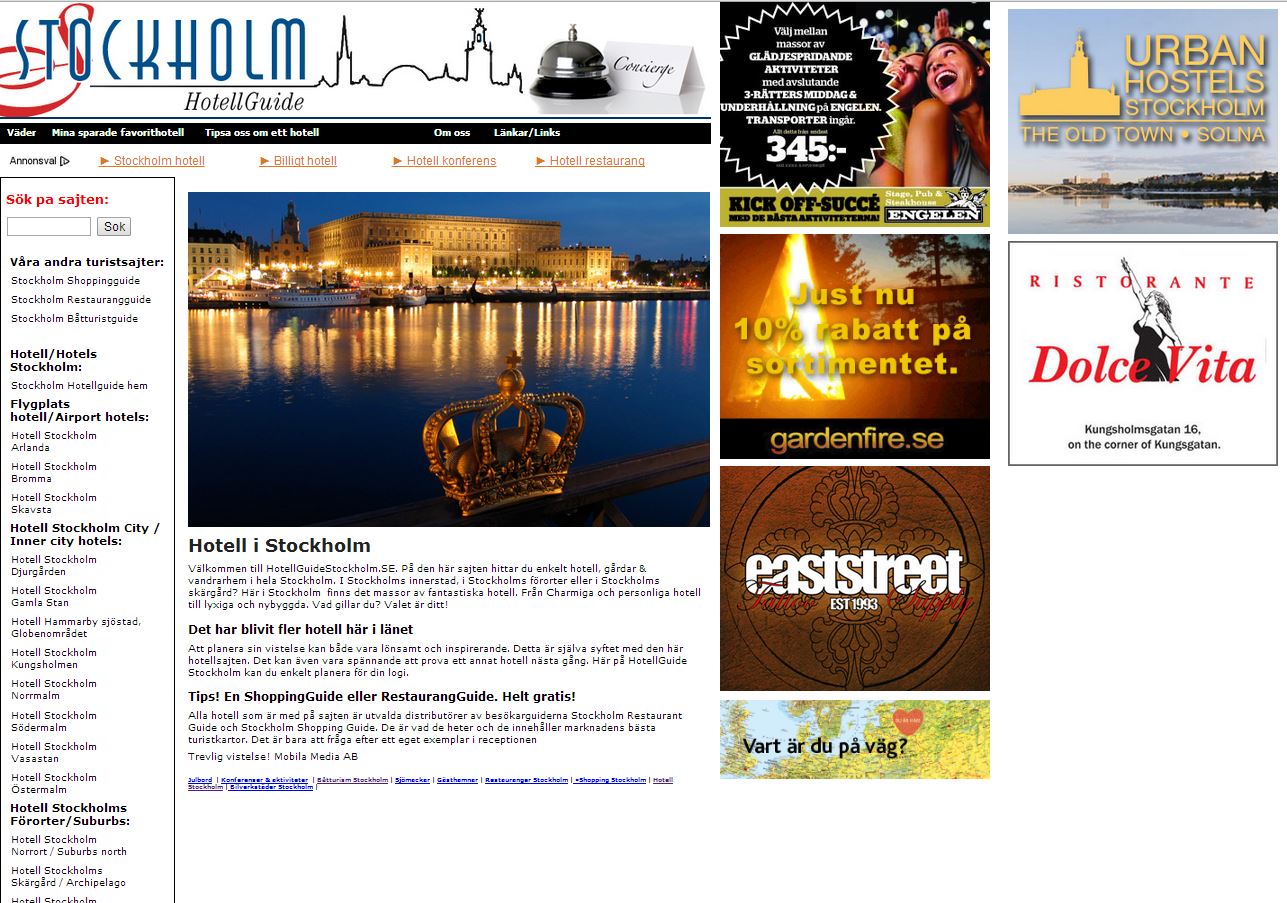 Det här en sajt som har ambitionen att lista alla Stockholms Hotell. Den ingår i de två föregående sajternas marknadsföringspaket. Hotellen som för utgåvorna Stockholm ShoppingGuide samt Stockholm RestaurangGuide i sina receptioner kommer gratis med på den här sajten. Besök så hittar du Hotell i Stockholm